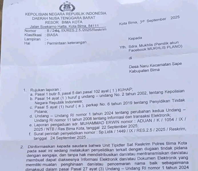NR diminta hadir untuk klarifikasi perkara dan membawa sejumlah wali murid sebagai saksi. Sebelumnya, laporan dugaan korupsi dana PIP 2022-2023 sempat dihentikan tanpa prosedur yang jelas.